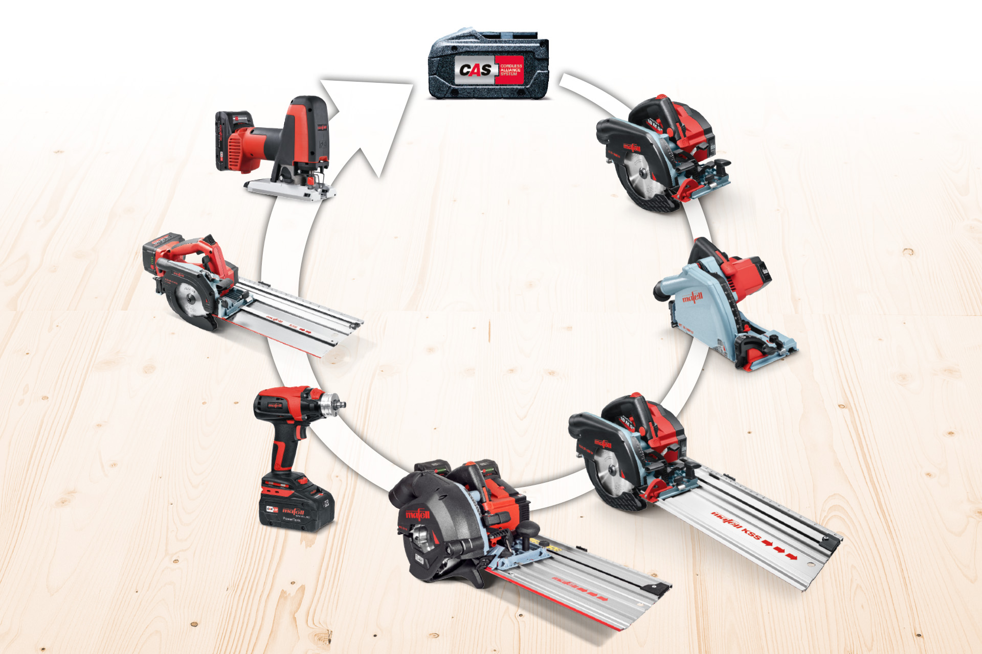 Los paquetes de batería son 100 % compatibles con máquinas MAFELL de la categoría de 18 V. Además, se adaptan sin limitaciones a todas las herramientas eléctricas compatibles con CAS – el sistema de batería independiente del fabricante para las marcas líderes de herramientas eléctricas. Esta alianza está disponible para una gran selección de potentes máquinas de batería con las más diversas aplicaciones. La ventaja es que permite tener menos sistemas de batería en la obra y, en el mejor de los casos, solo uno.